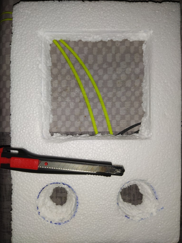 Una vez visto el material que vamos a utilizar es momento de empezar a trabajar. Lo primero que vamos a hacer será marcar el sitio en el que colocaremos el ventilador y los codos. En este caso yo he utilizado la misma caja que utilizo para hacer los yogures, así que para no dañar la tapa he utilizado una pieza de porexpan extra, pero se puede utilizar la tapa de la caja. A continuación solo tendremos que cortar las partes marcadas para que quepan el ventilador y las piezas de plástico. Para cortar las piezas podemos utilizar un cúter, lo que nos permitirá hacer cortes rápidos y limpios.