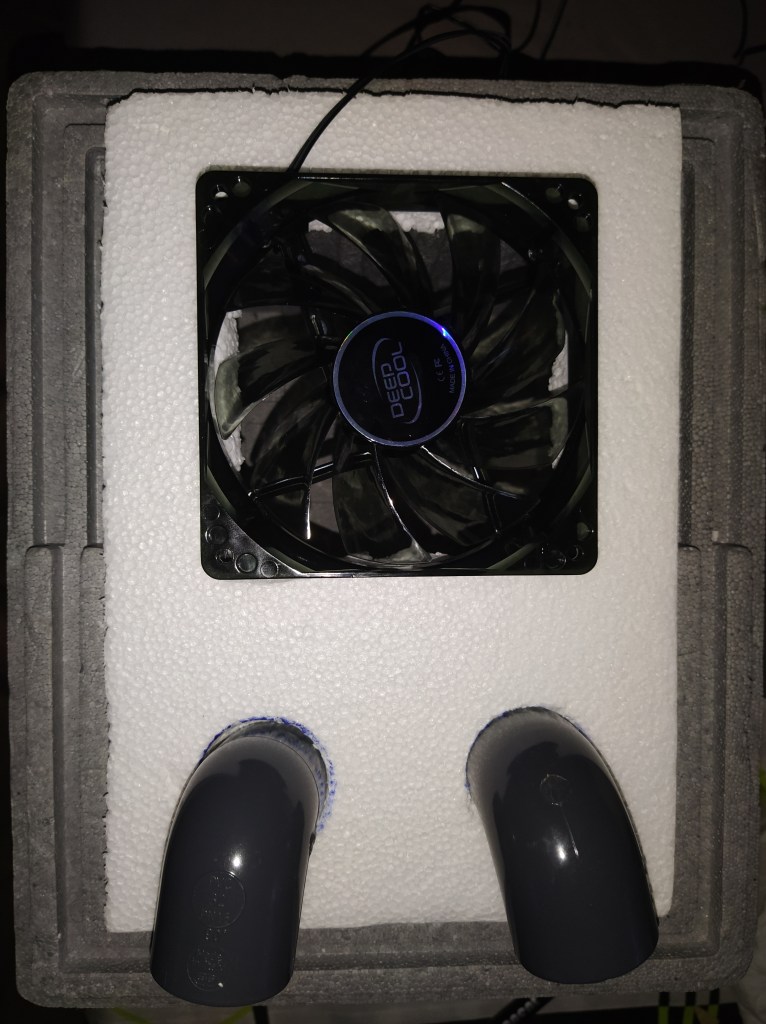 Es importante colocar el ventilador en la posición en la que impulse el aire hacia el interior de la caja. De esta manera el aire entra en la caja y se enfría con el hielo. Una vez el aire esta frio sale por las piezas de plástico, enfriando así el ambiente. Como las piezas no van a estar pegadas, vamos a poder orientar las salidas en la dirección que más nos apetezca.
