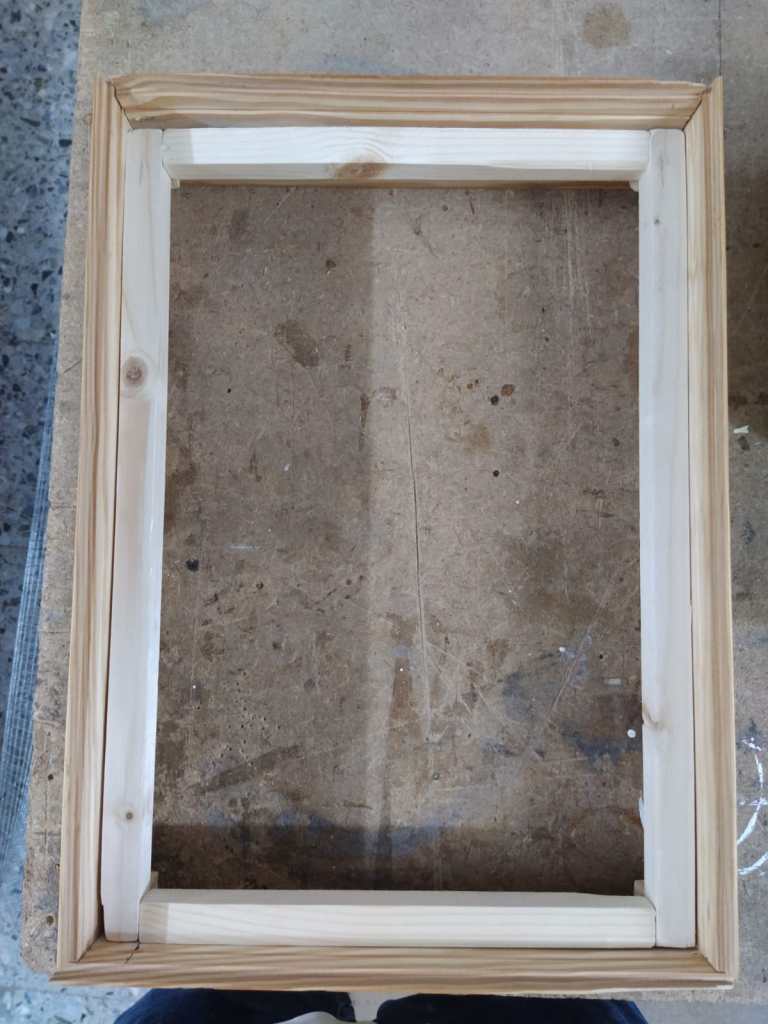 Lo primero que vamos a hacer será determinar al tamaño que va a tener nuestro deshidratador, personalmente con la finalidad de mejorar el manejo y posterior guardado recomiendo ajustar el tamaño a una hoja de papel DN A4. Sin embargo, el procedimento descrito a continuación es adaptable a distintos tamaños sin ningún problema. Así, utilizando el tamaño de la placa de plástico (que usaremos coma tapa de nuestro equipo) vamos a marcar las líneas de corte de los listones laterales. En este punto es importante recordar que la tapa tiene que quedar, justo por encima de los listones, con lo que el tamaño del marco formado por los listones tiene que ser un poco inferior a la anchura de la placa de plástico, para dar lugar a que la tapa se apoye en el marco una vez finalizada la construcción. Una vez marcados los listones procedemos a su corte y los unimos con clavos. Una vez realizado esto ya tenemos el marco exterior hecho. Ahora solo nos queda definir la bandeja donde pondremos los alimentos a deshidratar.