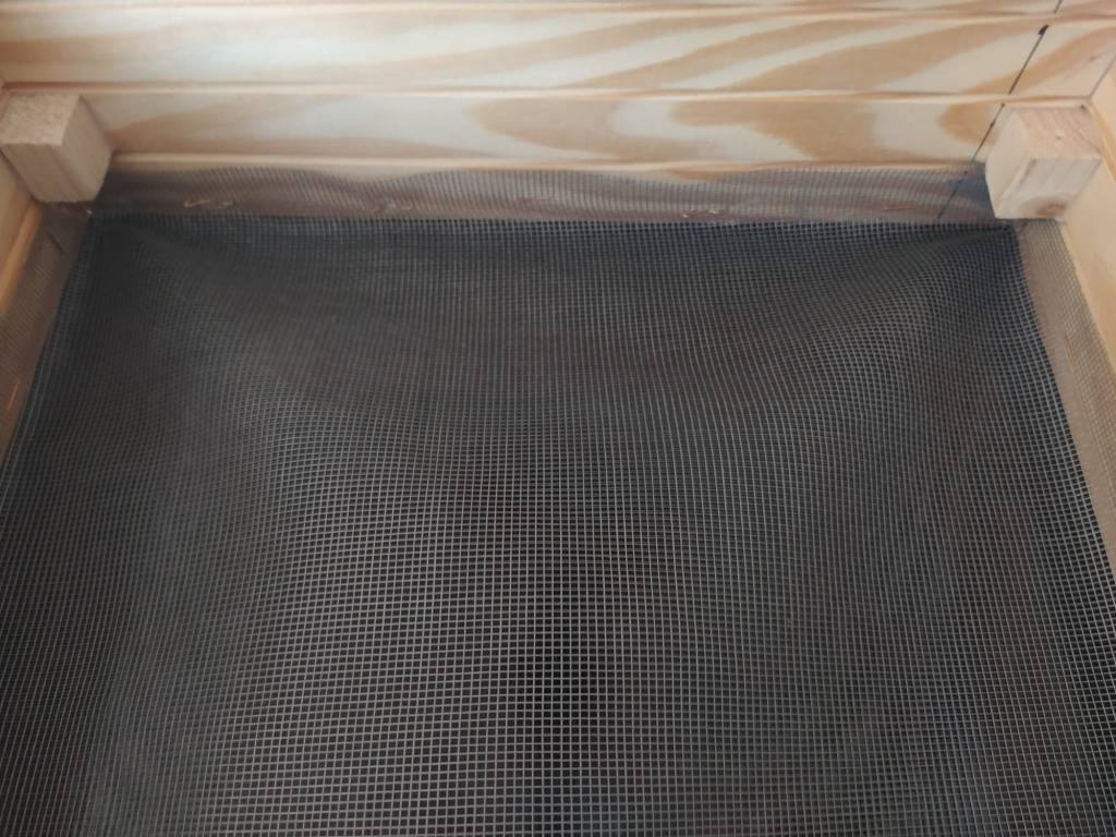 Con la finalidad de evitar que puedan entrar insectos en el interior del deshidratador colocaremos una tela mosquitera en la parte inferior, de esta manera facilitaremos que corra el aire, pero al mismo tiempo mantendremos a los insectos alejados de la comida. Así podemos presentar la malla por la cara interna del equipo y con la ayuda de una grapadora vamos fijando la malla. Al terminar podemos eliminar la tela sobrante con un cúter. Ahora que tenemos terminado el deshidratador ya lo podemos usar. Para utilizarlo solo lo tenemos que poner en un lugar con luz directa. De esta manera el aire en el interior se va a calentar y conseguirá eliminar la totalidad del agua de la comida, mejorando de este modo su conservación.
